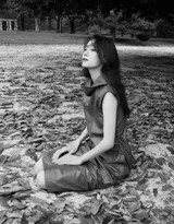 她双臂轻环膝盖坐于水边,背影单薄却充满故事感,与开阔的湖面形成动静对比,仿佛一幅写意水墨画。 张小斐仰头感受微风,颈项线条优美如天鹅,发丝凌乱飞舞,定格了风中瞬间的自由与灵动之美。